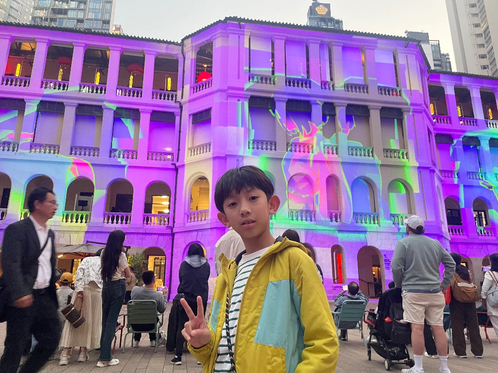 今天,我和爸爸媽媽乘搭港鐵去中環大館,我們特意去看光影表演。我覺得非常精彩。 現場還有很多人看,十分熱鬧。