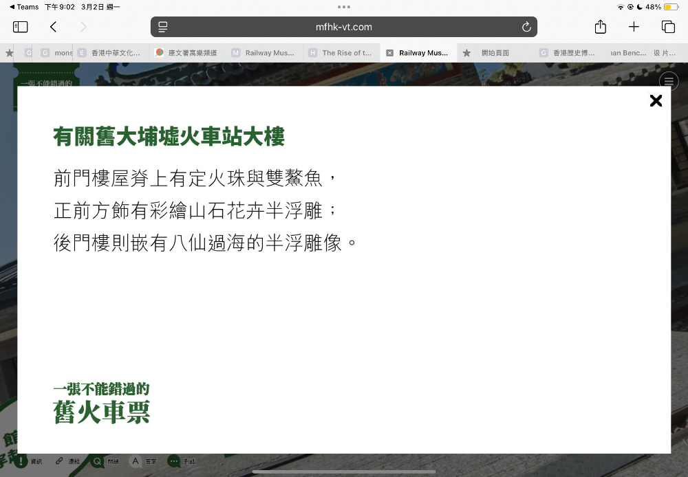 在这里我认识了香港铁路,了解了它的发展历史,欣赏到旧火车站建筑的特色与美丽。这次有意义的参观让我更加了解香港的过去,也学到了很多有趣的知识,收获满满。