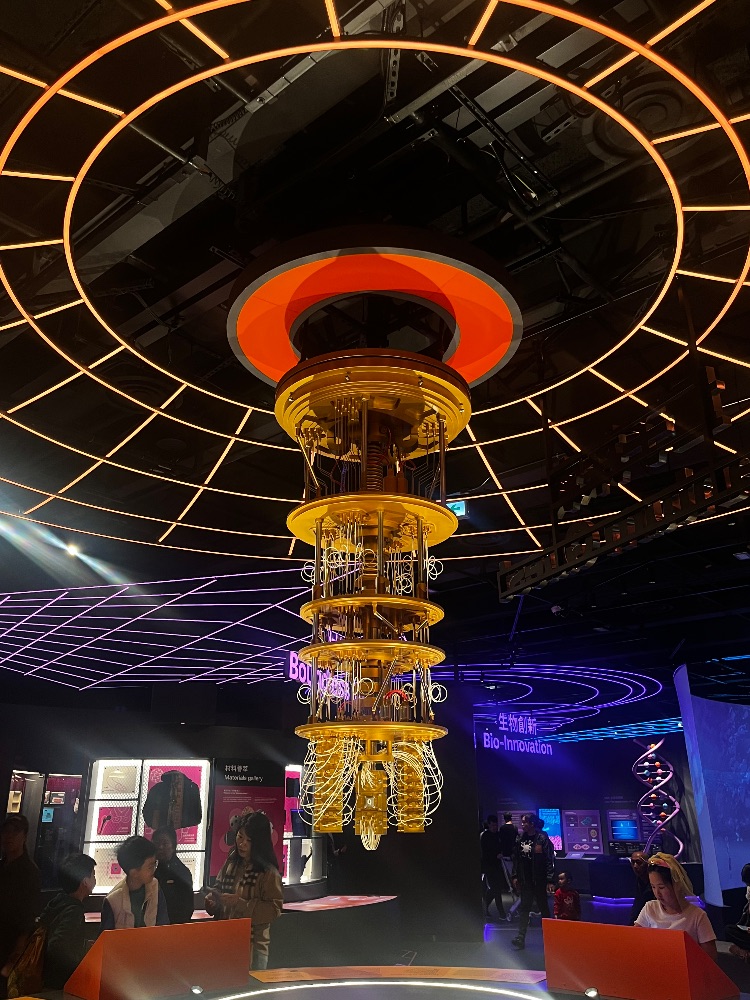 是位於香港科學館「創科展」的展品。如第一幅圖所示,這是一個高保真的DNA雙螺旋結構模型,彩色小球則代表四種不同的鹼基。第二幅圖就是一台量子計算機的處理器的模型。用於在接近絕對零度的環境中進行量子計算。