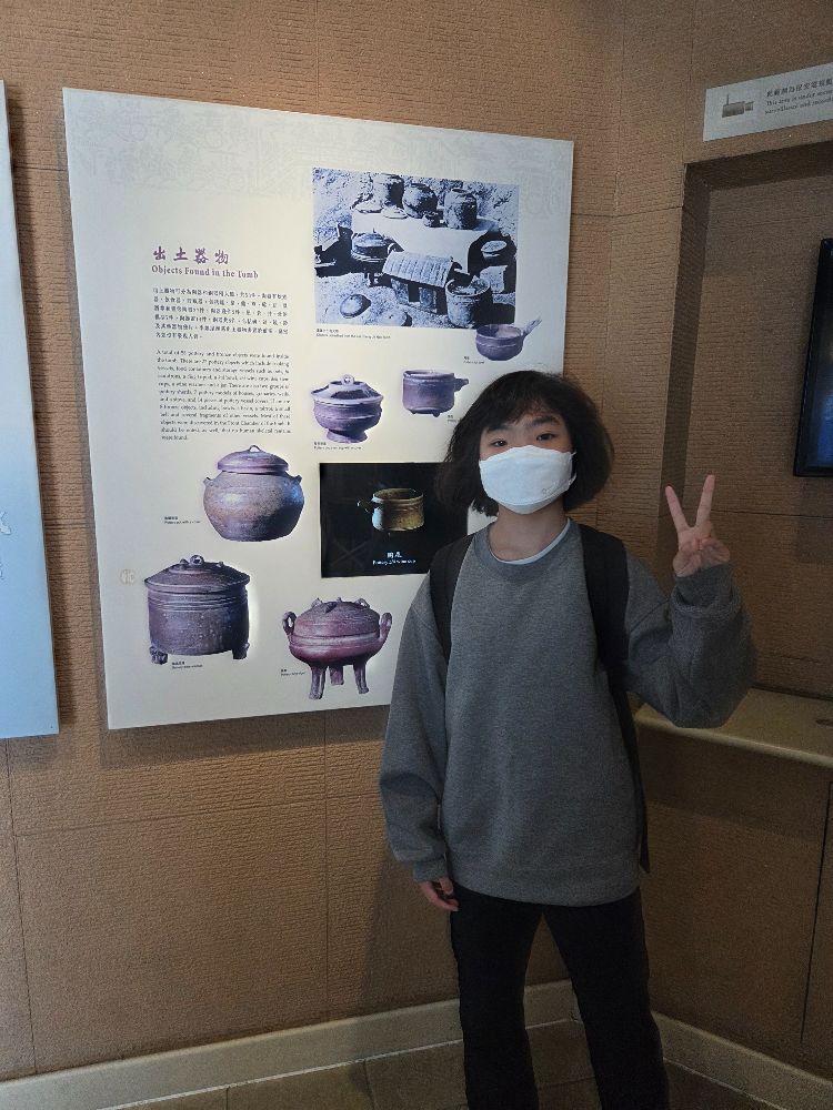 博物館內, 我隔著玻璃看到古墓的內貌, 雖然不能進入, 但都感到很新奇! 媽媽用手機讓我看全景, 看到古墓天花有"大吉番禺"四字。另外, 展覽廳內有很多出土文物, 包括炊煮器等陶器, 以及青銅器。