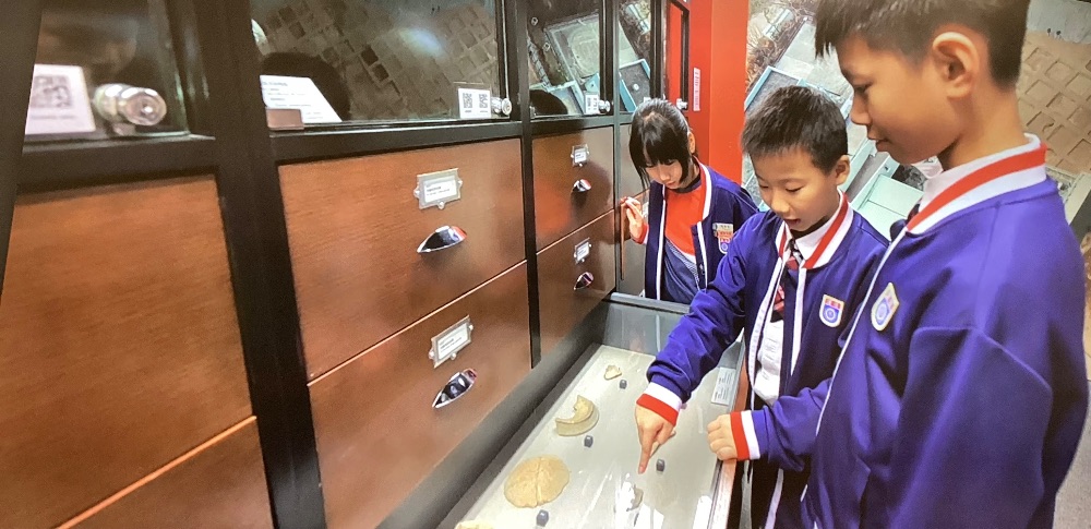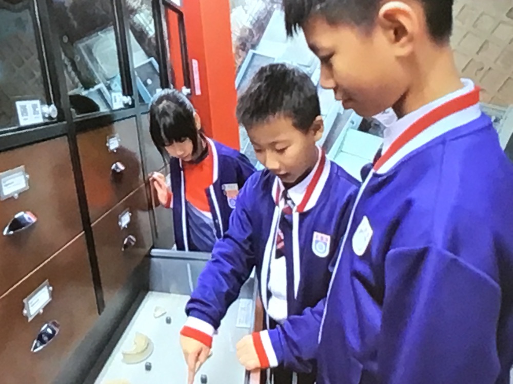 香港文物探知館一開始我们在門口拍了大合照,我們一迸探知館我就看到了以前的子弹和炮弹和以前的銀幣,然後我們就開盒看裏面的東西。