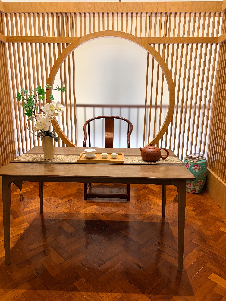 淺木格柵與圓月洞門勾勒出東方韻致,茶席上紫砂壺與白瓷杯靜置,蘭花點綴,暖光鋪灑,滿是寧靜淡雅的品茗意趣。
