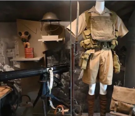 香港抗戰及海防博物館 ❶ 卡其色短袖襯衫、短褲與長襪,是英軍在東南亞及香港等熱帶 / 亞熱帶地區的典型製服,兼顧通風散熱與軍事標誌。