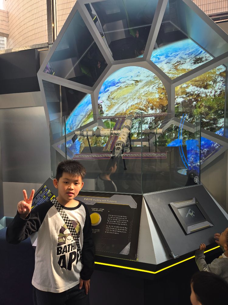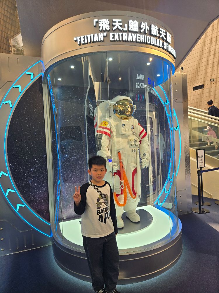 昨天,爸媽帶我和弟弟到太空館參觀,館裏有很多類型的模型,例如天宮對接、「飛天」艙外航天服和星外的形成等。還有很多有趣的遊戲,我玩了有關光速的踏單車太空重量的遊戲。在這我學會了不少知識,十分開心。
