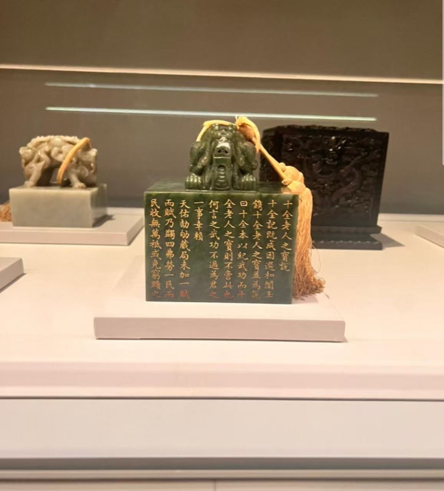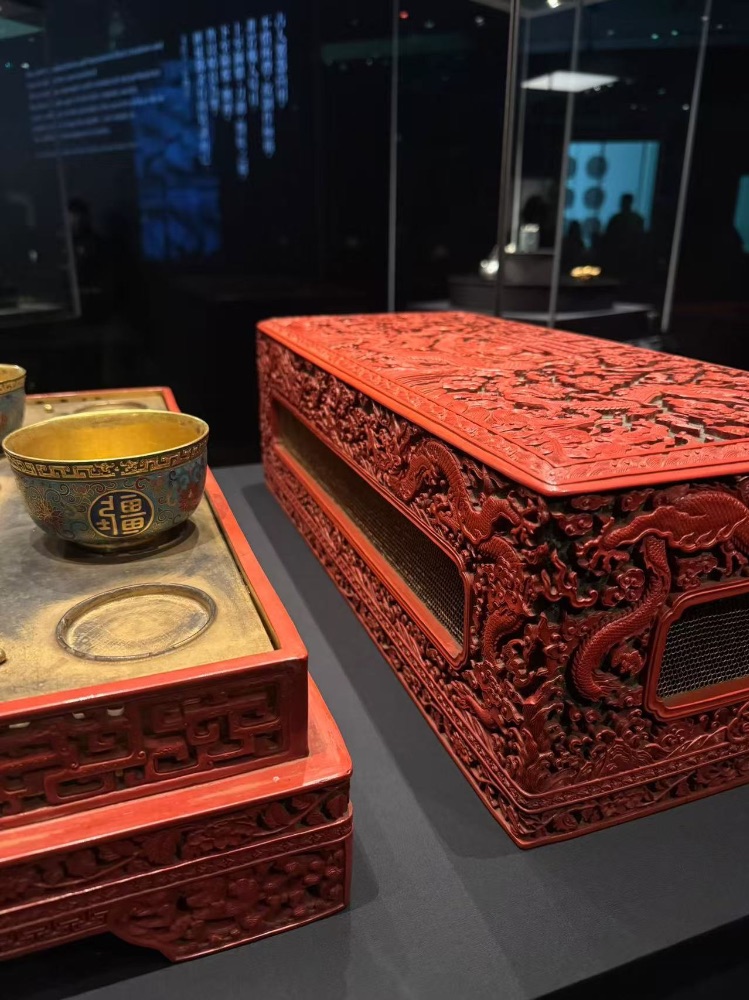 這個假期,我去了香港故宫文化博物館,欣賞了很多展品。下圖的展品是「為君难」印和剔紅漆飛龍宴盒(右側的紅箱)。